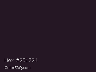 Hex #251724 Color is a very dark magenta color and the nearest color is Raisin Black #242124. Hex code #251724 and RGB value is rgb(37,23,36). In RGB color space, this color is composed of 15% red, 9% green, 14% blue, In CMYK color space, this color is composed of 0% cyan, 38% magenta, 3% yellow , 85% black , In HSL color space, this color has a hue angle of 304° , 23% saturation and 12% lightness.