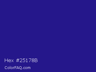 Hex #25178b Color is a normal indigo color and the nearest color is Jacksons Purple #20208d. Hex code #25178b and RGB value is rgb(37,23,139). In RGB color space, this color is composed of 15% red, 9% green, 55% blue, In CMYK color space, this color is composed of 73% cyan, 83% magenta, 0% yellow , 45% black , In HSL color space, this color has a hue angle of 247° , 72% saturation and 32% lightness.