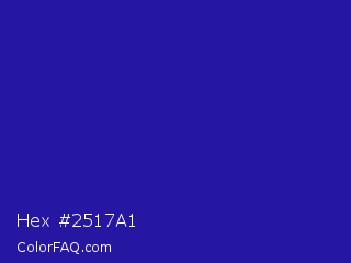 Hex #2517a1 Color is a normal indigo color and the nearest color is Jacksons Purple #20208d. Hex code #2517a1 and RGB value is rgb(37,23,161). In RGB color space, this color is composed of 15% red, 9% green, 63% blue, In CMYK color space, this color is composed of 77% cyan, 86% magenta, 0% yellow , 37% black , In HSL color space, this color has a hue angle of 246° , 75% saturation and 36% lightness.