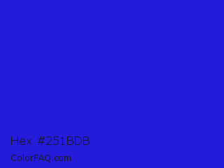 Hex #251bdb Color is a normal indigo color and the nearest color is Bluebonnet #1c1cf0. Hex code #251bdb and RGB value is rgb(37,27,219). In RGB color space, this color is composed of 15% red, 11% green, 86% blue, In CMYK color space, this color is composed of 83% cyan, 88% magenta, 0% yellow , 14% black , In HSL color space, this color has a hue angle of 243° , 78% saturation and 48% lightness.