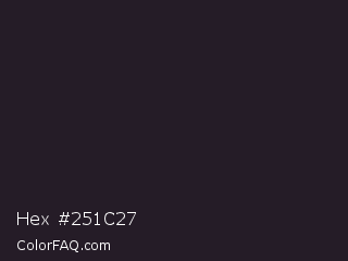 Hex #251c27 Color is a very dark purple color and the nearest color is Raisin Black #242124. Hex code #251c27 and RGB value is rgb(37,28,39). In RGB color space, this color is composed of 15% red, 11% green, 15% blue, In CMYK color space, this color is composed of 5% cyan, 28% magenta, 0% yellow , 85% black , In HSL color space, this color has a hue angle of 289° , 16% saturation and 13% lightness.