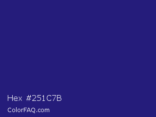 Hex #251c7b Color is a dark indigo color and the nearest color is St Patricks Blue #23297a. Hex code #251c7b and RGB value is rgb(37,28,123). In RGB color space, this color is composed of 15% red, 11% green, 48% blue, In CMYK color space, this color is composed of 70% cyan, 77% magenta, 0% yellow , 52% black , In HSL color space, this color has a hue angle of 246° , 63% saturation and 30% lightness.