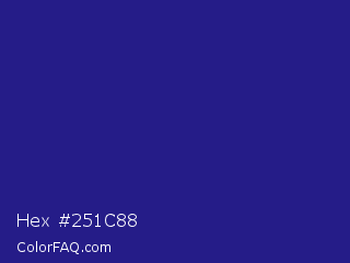 Hex #251c88 Color is a normal indigo color and the nearest color is Jacksons Purple #20208d. Hex code #251c88 and RGB value is rgb(37,28,136). In RGB color space, this color is composed of 15% red, 11% green, 53% blue, In CMYK color space, this color is composed of 73% cyan, 79% magenta, 0% yellow , 47% black , In HSL color space, this color has a hue angle of 245° , 66% saturation and 32% lightness.