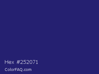 Hex #252071 Color is a dark indigo color and the nearest color is St Patricks Blue #23297a. Hex code #252071 and RGB value is rgb(37,32,113). In RGB color space, this color is composed of 15% red, 13% green, 44% blue, In CMYK color space, this color is composed of 67% cyan, 72% magenta, 0% yellow , 56% black , In HSL color space, this color has a hue angle of 244° , 56% saturation and 28% lightness.