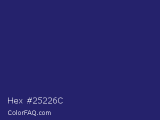 Hex #25226c Color is a dark indigo color and the nearest color is Lucky Point #1a1a68. Hex code #25226c and RGB value is rgb(37,34,108). In RGB color space, this color is composed of 15% red, 13% green, 42% blue, In CMYK color space, this color is composed of 66% cyan, 69% magenta, 0% yellow , 58% black , In HSL color space, this color has a hue angle of 242° , 52% saturation and 28% lightness.