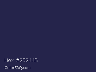 Hex #25244b Color is a very dark indigo color and the nearest color is Port Gore #251f4f. Hex code #25244b and RGB value is rgb(37,36,75). In RGB color space, this color is composed of 15% red, 14% green, 29% blue, In CMYK color space, this color is composed of 51% cyan, 52% magenta, 0% yellow , 71% black , In HSL color space, this color has a hue angle of 242° , 35% saturation and 22% lightness.