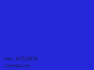 Hex #2528d8 Color is a normal blue color and the nearest color is Palatinate Blue #273be2. Hex code #2528d8 and RGB value is rgb(37,40,216). In RGB color space, this color is composed of 15% red, 16% green, 85% blue, In CMYK color space, this color is composed of 83% cyan, 81% magenta, 0% yellow , 15% black , In HSL color space, this color has a hue angle of 239° , 71% saturation and 50% lightness.