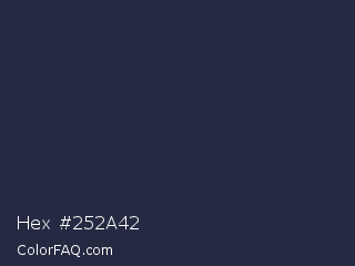 Hex #252a42 Color is a very dark blue color and the nearest color is Ebony Clay #26283b. Hex code #252a42 and RGB value is rgb(37,42,66). In RGB color space, this color is composed of 15% red, 16% green, 26% blue, In CMYK color space, this color is composed of 44% cyan, 36% magenta, 0% yellow , 74% black , In HSL color space, this color has a hue angle of 230° , 28% saturation and 20% lightness.