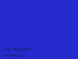 Hex #252bcd Color is a normal blue color and the nearest color is Persian Blue #1c39bb. Hex code #252bcd and RGB value is rgb(37,43,205). In RGB color space, this color is composed of 15% red, 17% green, 80% blue, In CMYK color space, this color is composed of 82% cyan, 79% magenta, 0% yellow , 20% black , In HSL color space, this color has a hue angle of 238° , 69% saturation and 47% lightness.
