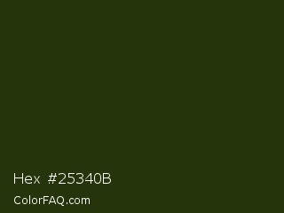 Hex #25340b Color is a very dark green color and the nearest color is Turtle Green #2a380b. Hex code #25340b and RGB value is rgb(37,52,11). In RGB color space, this color is composed of 15% red, 20% green, 4% blue, In CMYK color space, this color is composed of 29% cyan, 0% magenta, 79% yellow , 80% black , In HSL color space, this color has a hue angle of 82° , 65% saturation and 12% lightness.
