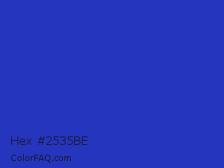 Hex #2535be Color is a normal blue color and the nearest color is Persian Blue #1c39bb. Hex code #2535be and RGB value is rgb(37,53,190). In RGB color space, this color is composed of 15% red, 21% green, 75% blue, In CMYK color space, this color is composed of 81% cyan, 72% magenta, 0% yellow , 25% black , In HSL color space, this color has a hue angle of 234° , 67% saturation and 45% lightness.