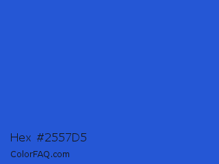 Hex #2557d5 Color is a normal blue color and the nearest color is New Car #214fc6. Hex code #2557d5 and RGB value is rgb(37,87,213). In RGB color space, this color is composed of 15% red, 34% green, 84% blue, In CMYK color space, this color is composed of 83% cyan, 59% magenta, 0% yellow , 16% black , In HSL color space, this color has a hue angle of 223° , 70% saturation and 49% lightness.