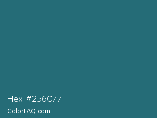 Hex #256c77 Color is a normal cyan color and the nearest color is Myrtle Green #317873. Hex code #256c77 and RGB value is rgb(37,108,119). In RGB color space, this color is composed of 15% red, 42% green, 47% blue, In CMYK color space, this color is composed of 69% cyan, 9% magenta, 0% yellow , 53% black , In HSL color space, this color has a hue angle of 188° , 53% saturation and 31% lightness.