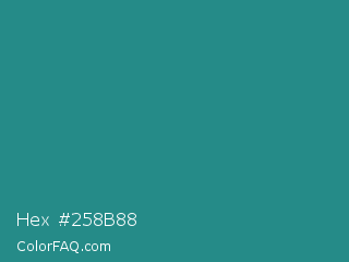 Hex #258b88 Color is a normal cyan color and the nearest color is Lochinvar #2c8c84. Hex code #258b88 and RGB value is rgb(37,139,136). In RGB color space, this color is composed of 15% red, 55% green, 53% blue, In CMYK color space, this color is composed of 73% cyan, 0% magenta, 2% yellow , 45% black , In HSL color space, this color has a hue angle of 178° , 58% saturation and 35% lightness.