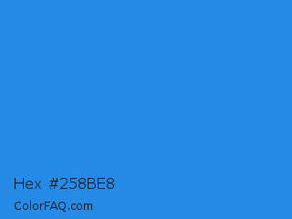 Hex #258be8 Color is a normal blue color and the nearest color is Bleu De France #318ce7. Hex code #258be8 and RGB value is rgb(37,139,232). In RGB color space, this color is composed of 15% red, 55% green, 91% blue, In CMYK color space, this color is composed of 84% cyan, 40% magenta, 0% yellow , 9% black , In HSL color space, this color has a hue angle of 209° , 81% saturation and 53% lightness.
