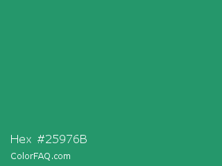 Hex #25976b Color is a normal green color and the nearest color is Illuminating Emerald #319177. Hex code #25976b and RGB value is rgb(37,151,107). In RGB color space, this color is composed of 15% red, 59% green, 42% blue, In CMYK color space, this color is composed of 75% cyan, 0% magenta, 29% yellow , 41% black , In HSL color space, this color has a hue angle of 157° , 61% saturation and 37% lightness.