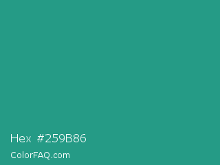 Hex #259b86 Color is a normal cyan color and the nearest color is Jungle Green #29ab87. Hex code #259b86 and RGB value is rgb(37,155,134). In RGB color space, this color is composed of 15% red, 61% green, 53% blue, In CMYK color space, this color is composed of 76% cyan, 0% magenta, 14% yellow , 39% black , In HSL color space, this color has a hue angle of 169° , 61% saturation and 38% lightness.