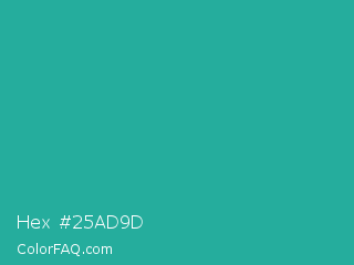 Hex #25ad9d Color is a normal cyan color and the nearest color is Light Sea Green #20b2aa. Hex code #25ad9d and RGB value is rgb(37,173,157). In RGB color space, this color is composed of 15% red, 68% green, 62% blue, In CMYK color space, this color is composed of 79% cyan, 0% magenta, 9% yellow , 32% black , In HSL color space, this color has a hue angle of 173° , 65% saturation and 41% lightness.