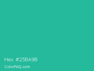 Hex #25ba9b Color is a normal cyan color and the nearest color is Mountain Meadow #30ba8f. Hex code #25ba9b and RGB value is rgb(37,186,155). In RGB color space, this color is composed of 15% red, 73% green, 61% blue, In CMYK color space, this color is composed of 80% cyan, 0% magenta, 17% yellow , 27% black , In HSL color space, this color has a hue angle of 168° , 67% saturation and 44% lightness.