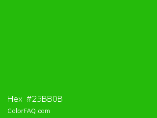 Hex #25bb0b Color is a normal green color and the nearest color is Harlequin Green #46cb18. Hex code #25bb0b and RGB value is rgb(37,187,11). In RGB color space, this color is composed of 15% red, 73% green, 4% blue, In CMYK color space, this color is composed of 80% cyan, 0% magenta, 94% yellow , 27% black , In HSL color space, this color has a hue angle of 111° , 89% saturation and 39% lightness.