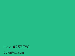Hex #25be88 Color is a normal green color and the nearest color is Mountain Meadow #30ba8f. Hex code #25be88 and RGB value is rgb(37,190,136). In RGB color space, this color is composed of 15% red, 75% green, 53% blue, In CMYK color space, this color is composed of 81% cyan, 0% magenta, 28% yellow , 25% black , In HSL color space, this color has a hue angle of 159° , 67% saturation and 45% lightness.