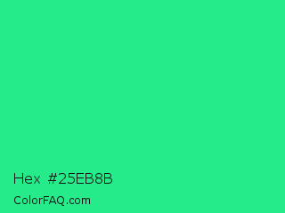 Hex #25eb8b Color is a normal green color and the nearest color is Shamrock #33cc99. Hex code #25eb8b and RGB value is rgb(37,235,139). In RGB color space, this color is composed of 15% red, 92% green, 55% blue, In CMYK color space, this color is composed of 84% cyan, 0% magenta, 41% yellow , 8% black , In HSL color space, this color has a hue angle of 151° , 83% saturation and 53% lightness.