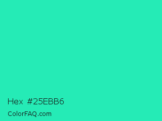 Hex #25ebb6 Color is a normal cyan color and the nearest color is Turquoise PWG #30d5c8. Hex code #25ebb6 and RGB value is rgb(37,235,182). In RGB color space, this color is composed of 15% red, 92% green, 71% blue, In CMYK color space, this color is composed of 84% cyan, 0% magenta, 23% yellow , 8% black , In HSL color space, this color has a hue angle of 164° , 83% saturation and 53% lightness.