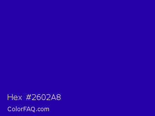 Hex #2602a8 Color is a normal indigo color and the nearest color is Blue Gem #2c0e8c. Hex code #2602a8 and RGB value is rgb(38,2,168). In RGB color space, this color is composed of 15% red, 1% green, 66% blue, In CMYK color space, this color is composed of 77% cyan, 99% magenta, 0% yellow , 34% black , In HSL color space, this color has a hue angle of 253° , 98% saturation and 33% lightness.