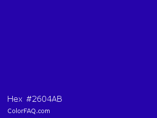 Hex #2604ab Color is a normal indigo color and the nearest color is Blue Gem #2c0e8c. Hex code #2604ab and RGB value is rgb(38,4,171). In RGB color space, this color is composed of 15% red, 2% green, 67% blue, In CMYK color space, this color is composed of 78% cyan, 98% magenta, 0% yellow , 33% black , In HSL color space, this color has a hue angle of 252° , 95% saturation and 34% lightness.
