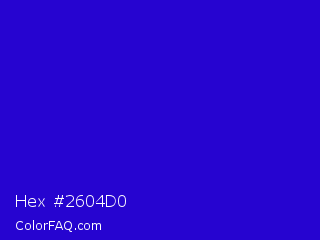 Hex #2604d0 Color is a normal indigo color and the nearest color is Interdimensional Blue #360ccc. Hex code #2604d0 and RGB value is rgb(38,4,208). In RGB color space, this color is composed of 15% red, 2% green, 82% blue, In CMYK color space, this color is composed of 82% cyan, 98% magenta, 0% yellow , 18% black , In HSL color space, this color has a hue angle of 250° , 96% saturation and 42% lightness.