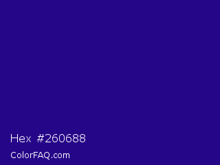 Hex #260688 Color is a dark indigo color and the nearest color is Blue Gem #2c0e8c. Hex code #260688 and RGB value is rgb(38,6,136). In RGB color space, this color is composed of 15% red, 2% green, 53% blue, In CMYK color space, this color is composed of 72% cyan, 96% magenta, 0% yellow , 47% black , In HSL color space, this color has a hue angle of 255° , 92% saturation and 28% lightness.