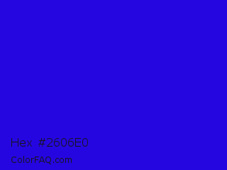 Hex #2606e0 Color is a normal indigo color and the nearest color is Interdimensional Blue #360ccc. Hex code #2606e0 and RGB value is rgb(38,6,224). In RGB color space, this color is composed of 15% red, 2% green, 88% blue, In CMYK color space, this color is composed of 83% cyan, 97% magenta, 0% yellow , 12% black , In HSL color space, this color has a hue angle of 249° , 95% saturation and 45% lightness.
