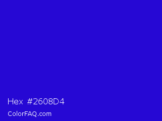 Hex #2608d4 Color is a normal indigo color and the nearest color is Interdimensional Blue #360ccc. Hex code #2608d4 and RGB value is rgb(38,8,212). In RGB color space, this color is composed of 15% red, 3% green, 83% blue, In CMYK color space, this color is composed of 82% cyan, 96% magenta, 0% yellow , 17% black , In HSL color space, this color has a hue angle of 249° , 93% saturation and 43% lightness.
