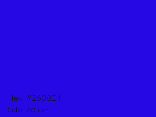 Hex #2608e4 Color is a normal indigo color and the nearest color is Bluebonnet #1c1cf0. Hex code #2608e4 and RGB value is rgb(38,8,228). In RGB color space, this color is composed of 15% red, 3% green, 89% blue, In CMYK color space, this color is composed of 83% cyan, 96% magenta, 0% yellow , 11% black , In HSL color space, this color has a hue angle of 248° , 93% saturation and 46% lightness.