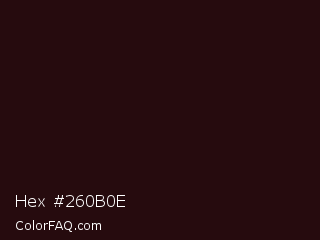 Hex #260b0e Color is a very dark red color and the nearest color is Coffee Bean #2a140e. Hex code #260b0e and RGB value is rgb(38,11,14). In RGB color space, this color is composed of 15% red, 4% green, 5% blue, In CMYK color space, this color is composed of 0% cyan, 71% magenta, 63% yellow , 85% black , In HSL color space, this color has a hue angle of 353° , 55% saturation and 10% lightness.