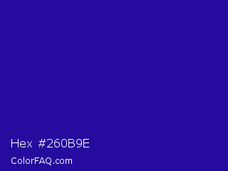 Hex #260b9e Color is a normal indigo color and the nearest color is Blue Gem #2c0e8c. Hex code #260b9e and RGB value is rgb(38,11,158). In RGB color space, this color is composed of 15% red, 4% green, 62% blue, In CMYK color space, this color is composed of 76% cyan, 93% magenta, 0% yellow , 38% black , In HSL color space, this color has a hue angle of 251° , 87% saturation and 33% lightness.