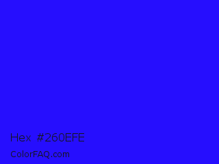 Hex #260efe Color is a normal indigo color and the nearest color is Bluebonnet #1c1cf0. Hex code #260efe and RGB value is rgb(38,14,254). In RGB color space, this color is composed of 15% red, 5% green, 100% blue, In CMYK color space, this color is composed of 85% cyan, 94% magenta, 0% yellow , 0% black , In HSL color space, this color has a hue angle of 246° , 99% saturation and 53% lightness.