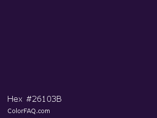 Hex #26103b Color is a very dark purple color and the nearest color is Violet #240a40. Hex code #26103b and RGB value is rgb(38,16,59). In RGB color space, this color is composed of 15% red, 6% green, 23% blue, In CMYK color space, this color is composed of 36% cyan, 73% magenta, 0% yellow , 77% black , In HSL color space, this color has a hue angle of 271° , 57% saturation and 15% lightness.