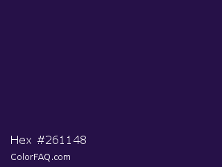 Hex #261148 Color is a very dark violet color and the nearest color is Violet #240a40. Hex code #261148 and RGB value is rgb(38,17,72). In RGB color space, this color is composed of 15% red, 7% green, 28% blue, In CMYK color space, this color is composed of 47% cyan, 76% magenta, 0% yellow , 72% black , In HSL color space, this color has a hue angle of 263° , 62% saturation and 17% lightness.