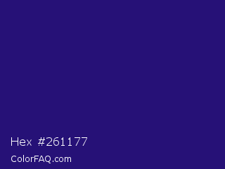 Hex #261177 Color is a dark indigo color and the nearest color is Deep Blue #220878. Hex code #261177 and RGB value is rgb(38,17,119). In RGB color space, this color is composed of 15% red, 7% green, 47% blue, In CMYK color space, this color is composed of 68% cyan, 86% magenta, 0% yellow , 53% black , In HSL color space, this color has a hue angle of 252° , 75% saturation and 27% lightness.