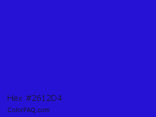 Hex #2612d4 Color is a normal indigo color and the nearest color is Interdimensional Blue #360ccc. Hex code #2612d4 and RGB value is rgb(38,18,212). In RGB color space, this color is composed of 15% red, 7% green, 83% blue, In CMYK color space, this color is composed of 82% cyan, 92% magenta, 0% yellow , 17% black , In HSL color space, this color has a hue angle of 246° , 84% saturation and 45% lightness.