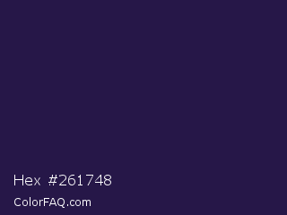 Hex #261748 Color is a very dark indigo color and the nearest color is Valhalla #2b194f. Hex code #261748 and RGB value is rgb(38,23,72). In RGB color space, this color is composed of 15% red, 9% green, 28% blue, In CMYK color space, this color is composed of 47% cyan, 68% magenta, 0% yellow , 72% black , In HSL color space, this color has a hue angle of 258° , 52% saturation and 19% lightness.
