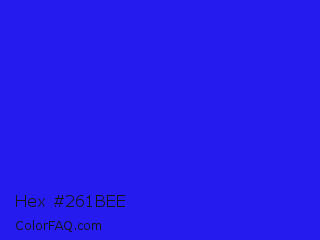 Hex #261bee Color is a normal indigo color and the nearest color is Bluebonnet #1c1cf0. Hex code #261bee and RGB value is rgb(38,27,238). In RGB color space, this color is composed of 15% red, 11% green, 93% blue, In CMYK color space, this color is composed of 84% cyan, 89% magenta, 0% yellow , 7% black , In HSL color space, this color has a hue angle of 243° , 86% saturation and 52% lightness.