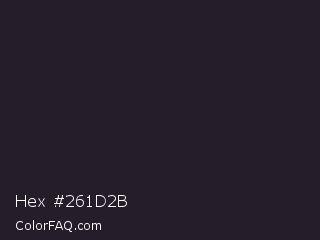 Hex #261d2b Color is a very dark purple color and the nearest color is Bastille #292130. Hex code #261d2b and RGB value is rgb(38,29,43). In RGB color space, this color is composed of 15% red, 11% green, 17% blue, In CMYK color space, this color is composed of 12% cyan, 33% magenta, 0% yellow , 83% black , In HSL color space, this color has a hue angle of 279° , 19% saturation and 14% lightness.