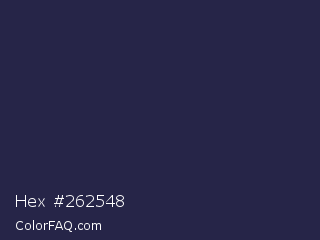 Hex #262548 Color is a very dark indigo color and the nearest color is Port Gore #251f4f. Hex code #262548 and RGB value is rgb(38,37,72). In RGB color space, this color is composed of 15% red, 15% green, 28% blue, In CMYK color space, this color is composed of 47% cyan, 49% magenta, 0% yellow , 72% black , In HSL color space, this color has a hue angle of 242° , 32% saturation and 21% lightness.
