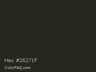 Hex #26271f Color is a very dark yellow color and the nearest color is Log Cabin #242a1d. Hex code #26271f and RGB value is rgb(38,39,31). In RGB color space, this color is composed of 15% red, 15% green, 12% blue, In CMYK color space, this color is composed of 3% cyan, 0% magenta, 21% yellow , 85% black , In HSL color space, this color has a hue angle of 68° , 11% saturation and 14% lightness.