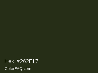 Hex #262e17 Color is a very dark green color and the nearest color is Black Olive #242e16. Hex code #262e17 and RGB value is rgb(38,46,23). In RGB color space, this color is composed of 15% red, 18% green, 9% blue, In CMYK color space, this color is composed of 17% cyan, 0% magenta, 50% yellow , 82% black , In HSL color space, this color has a hue angle of 81° , 33% saturation and 14% lightness.