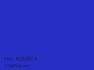 Hex #262ec4 Color is a normal blue color and the nearest color is Persian Blue #1c39bb. Hex code #262ec4 and RGB value is rgb(38,46,196). In RGB color space, this color is composed of 15% red, 18% green, 77% blue, In CMYK color space, this color is composed of 81% cyan, 77% magenta, 0% yellow , 23% black , In HSL color space, this color has a hue angle of 237° , 68% saturation and 46% lightness.