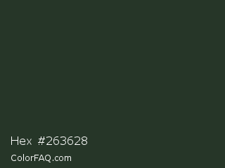 Hex #263628 Color is a very dark green color and the nearest color is Black Leather Jacket #253529. Hex code #263628 and RGB value is rgb(38,54,40). In RGB color space, this color is composed of 15% red, 21% green, 16% blue, In CMYK color space, this color is composed of 30% cyan, 0% magenta, 26% yellow , 79% black , In HSL color space, this color has a hue angle of 128° , 17% saturation and 18% lightness.