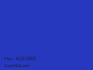 Hex #2638be Color is a normal blue color and the nearest color is Persian Blue #1c39bb. Hex code #2638be and RGB value is rgb(38,56,190). In RGB color space, this color is composed of 15% red, 22% green, 75% blue, In CMYK color space, this color is composed of 80% cyan, 71% magenta, 0% yellow , 25% black , In HSL color space, this color has a hue angle of 233° , 67% saturation and 45% lightness.